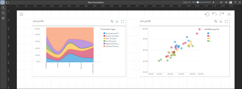 Fixed: a plain layout, with a grid that can be disabled. Visualizations can be placed anywhere on the canvas. Toggle the grid on and off from the Design ribbon.