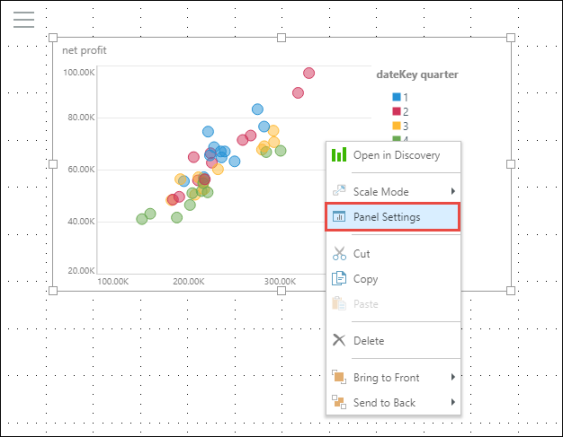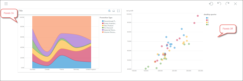 Enable visualization panels to show panel tools in runtime by default. When panels are not enabled, these panels are only visible in runtime when the user hovers over the visualization.