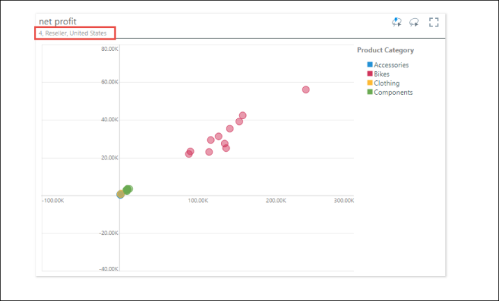 Breadcrumbs are a horizontal list underneath the title, displaying the path to the current element. Whenever you use drill and dice functions to interact with the visual, the breadcrumb list will grow to show you that path.