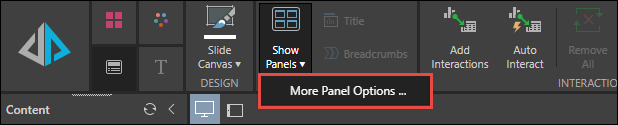- Panels can be enabled and disabled from the Show Panels button on the Home, Component, and Slide ribbons