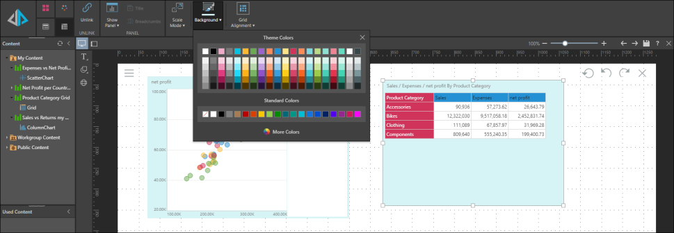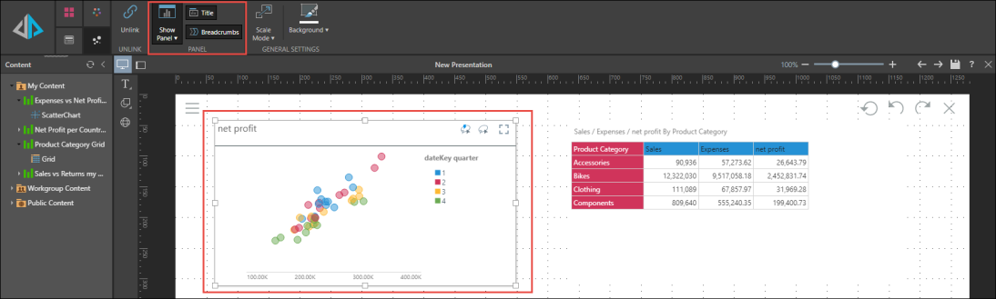 The following article covers formatting options available at the visualization level. These functions are located in the Component and Slide ribbons.
