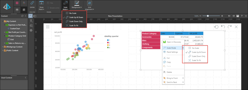 Open the Scale Mode menu to apply a scale to a visualization. This will enable scaling of the visual when the size of the canvas, page, or window is changed. For details about the different scaling options, see Scale Modes.