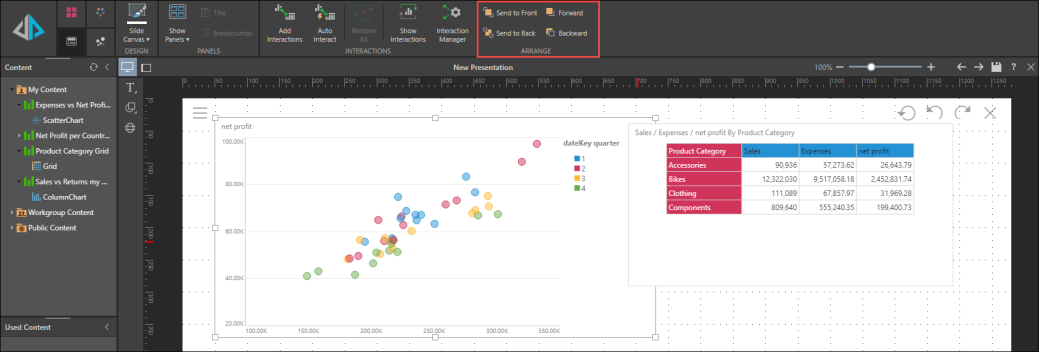 Click on a visualization to enable the Arrange options in the Slide ribbon.