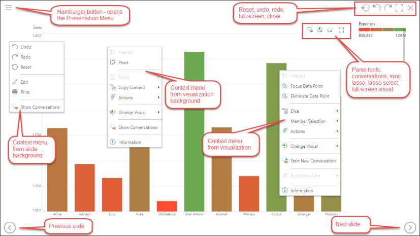 Launch your presentation in runtime mode to access the content's functionality. From the slides, users can: