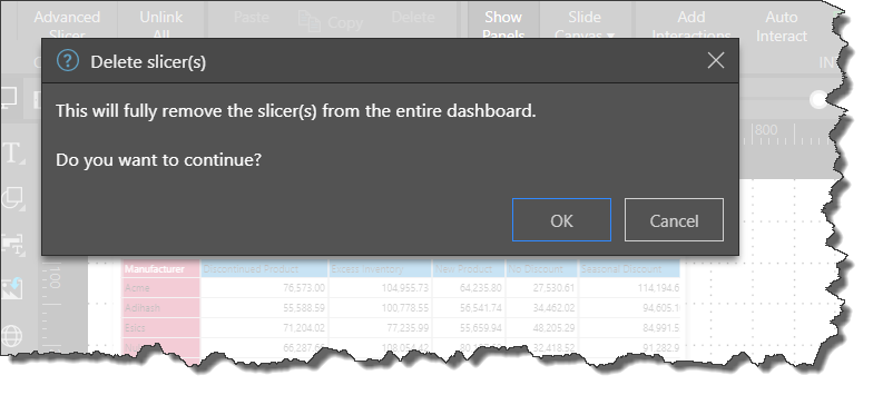 There are several different ways to delete slicers from your presentation. Once you delete your slicer, you will be asked to confirm your selection via the Delete Slicer(s) dialog.