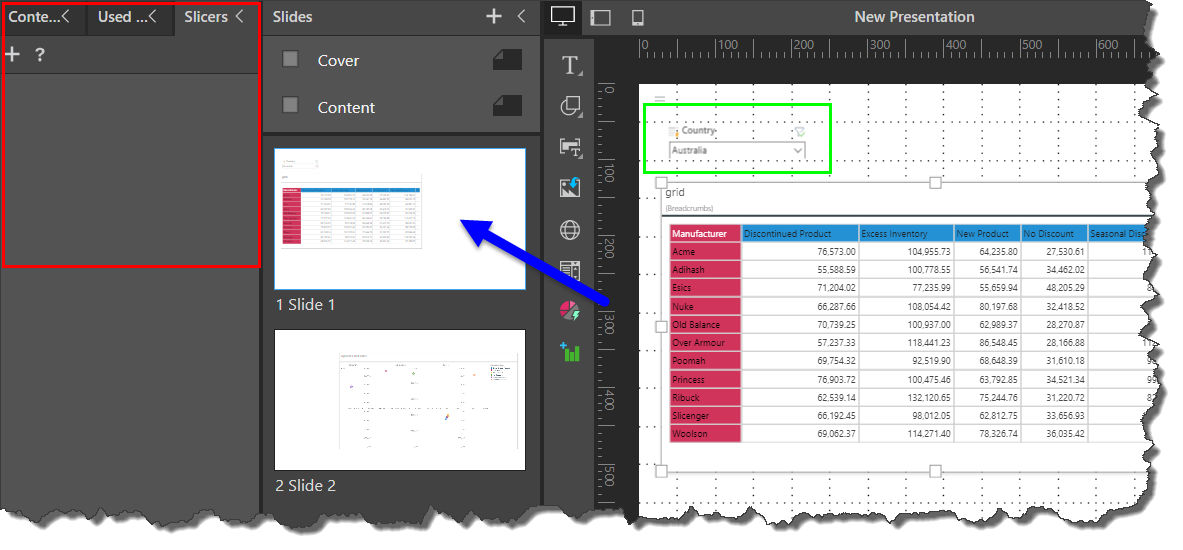 Here, a slicer (green highlight below), was added to the first slide in the presentation and interaction was added between the slicer and the grid on the same slide. When Slide 1 is selected from the Slides panel (blue arrow), the Slicers panel is empty (red highlight).