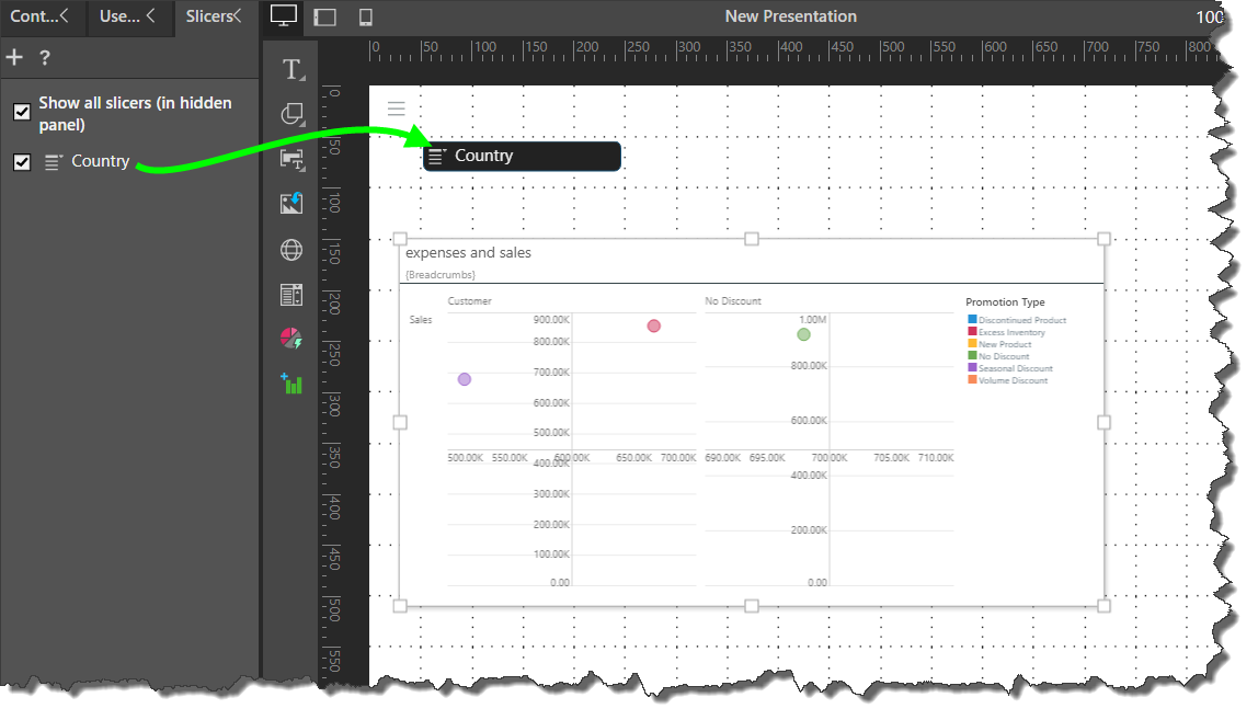 Alternatively, add the slicer to the selected slide by dragging it from the Slicers panel and dropping onto the slide: