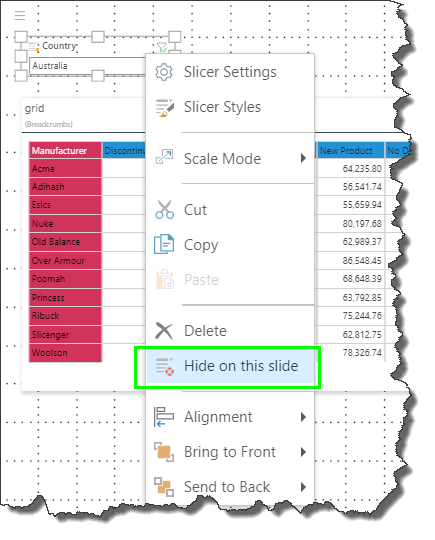 You can also use the Hide function to move a slicer from the slide to the hidden slicer panel, so that it won't appear on any slide in the presentation. To achieve this, right click on the slicer and select 'Hide on this slide'. The slicer be removed from the slide and added to the Slicer panel.