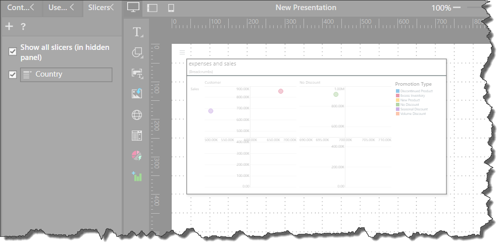 Hidden slicers are enabled for each slide by default, and they appear in the Presentation whether or not any interactions have been set. You can turn off a hidden slicer by deselecting it from the Slicers panel while the relevant slide is selected; in this scenario, the hidden slicer will not be rendered for the given slide when the presentation is launched in runtime.