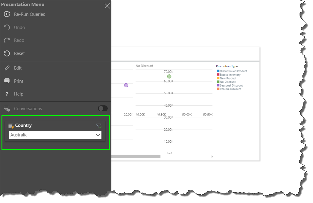 If required, you can add an interaction directly from the slicer in the Slicers panel to the visual on the selected slide. Adding an interaction in this way will create a hidden slicer when the presentation is rendered in runtime.