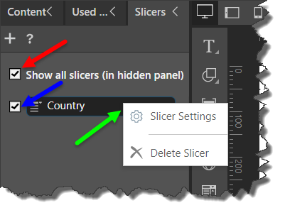 - Right click on a hidden slicer to open its Settings dialog, or delete it (green arrow).