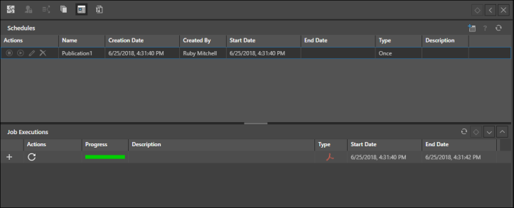 Click the New Schedule icon to create a new publication schedule. In the Actions column, stop or start a schedule, edit a schedule, or delete a schedule:
