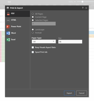 To print and export your publication without sharing or scheduling it, click the Pyramid button in the top left corner of the user interface. If you have any slicers included in your report design, you can select the relevant slice of data you wish to print. The slice choices appear at the top of the dialog.