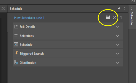 Once you are done building your schedule, click the save button to save and launch it. You can view the schedule's progress in the content explorer (or from the admin console if you are an admin). Access the publication's schedules can be done from the content explorer - where you can manage the schedules (edit, delete etc)