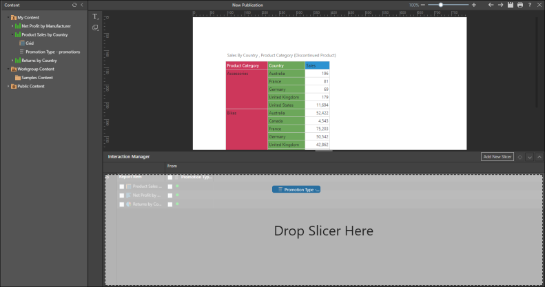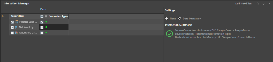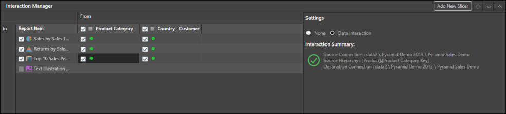 Adding a slicer will open the Interaction Manager, which is an interface used to connect slicers to publication components (visualizations, dynamic assets, and sections). The interface handles the wiring up of the data elements even if they are from different data models, in different databases, or on different servers.