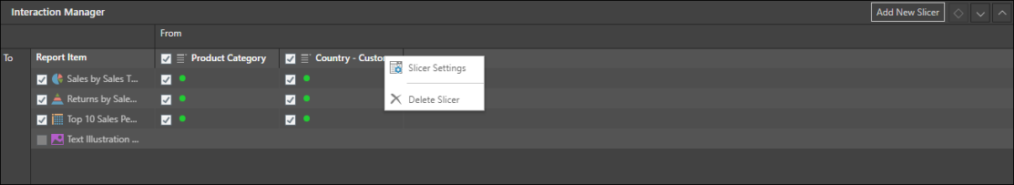 To edit or delete a slicer, open the Interaction Manager. Right click on the slicer heading and select Delete to remove the slicer, or Slicer Settings to change the title of the slicer.