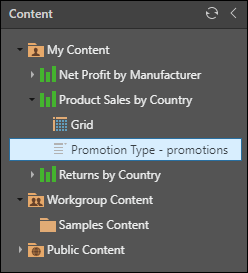 To add filter or parameter slicers that have been saved as part of a query in Discover, find the relevant slicer in the Content folders.