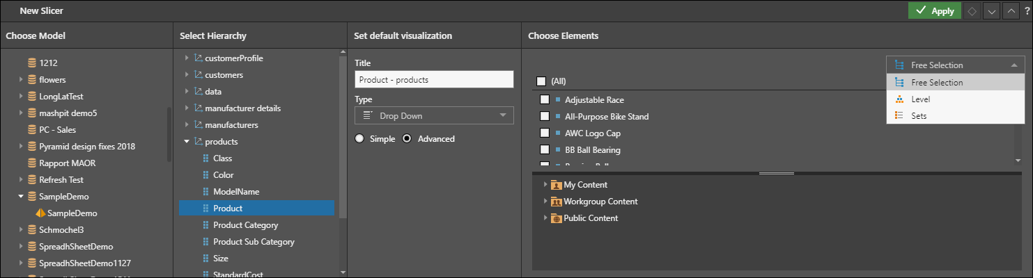 In Set Default Visualization, name your slicer and choose a slicer Type. To specify elements, hierarchy levels, sets, or parameters, switch to Advanced.