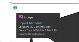An information icon appears in the top left corner of each content item added to a publication; hover over the icon to see the item's metadata panel.