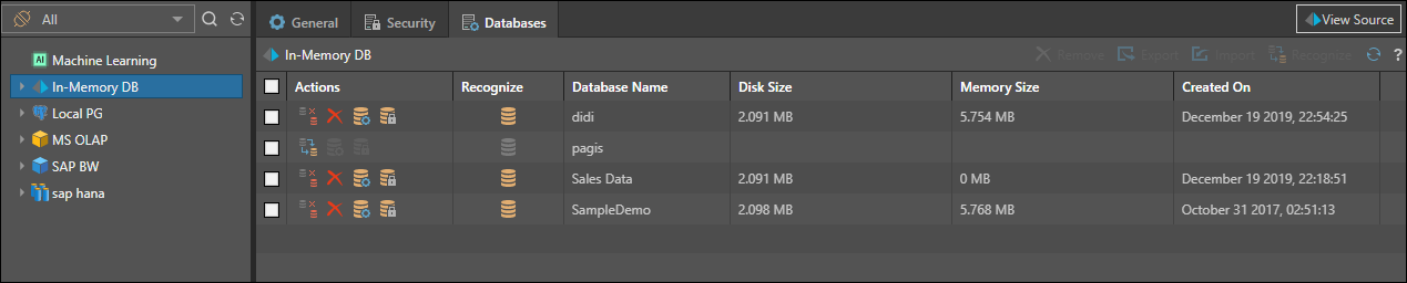 - Recognize: indicates if the database is currently recognized in Pyramid. If not, you can select the database and click recognize it. You can also select a materialized database and click Remove to de-materialize it.