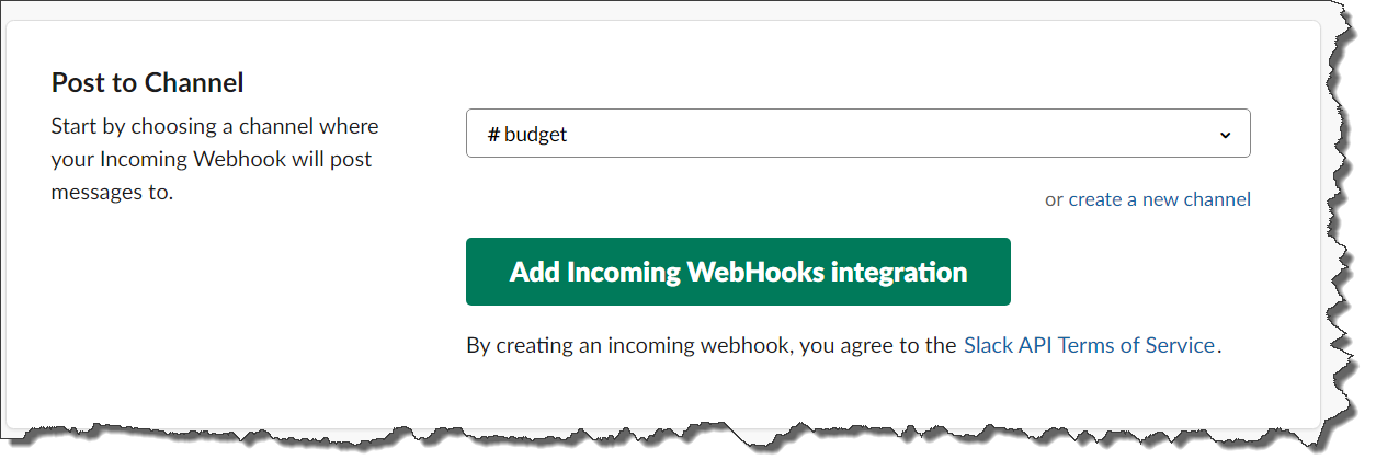 You will be directed to the WebHooks app's 'New configuration' page. From 'Post to Channel' choose the channel to which the Webhook should be sent, then click 'Add Incoming WebHooks integration'.