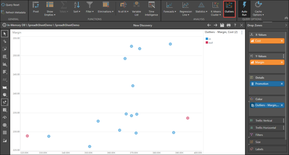 To use the Outliers function, simply click the Outliers button from the Query ribbon. A custom column called Outliers will be auto- added to the Color drop zone, and to the Dimensions panel.