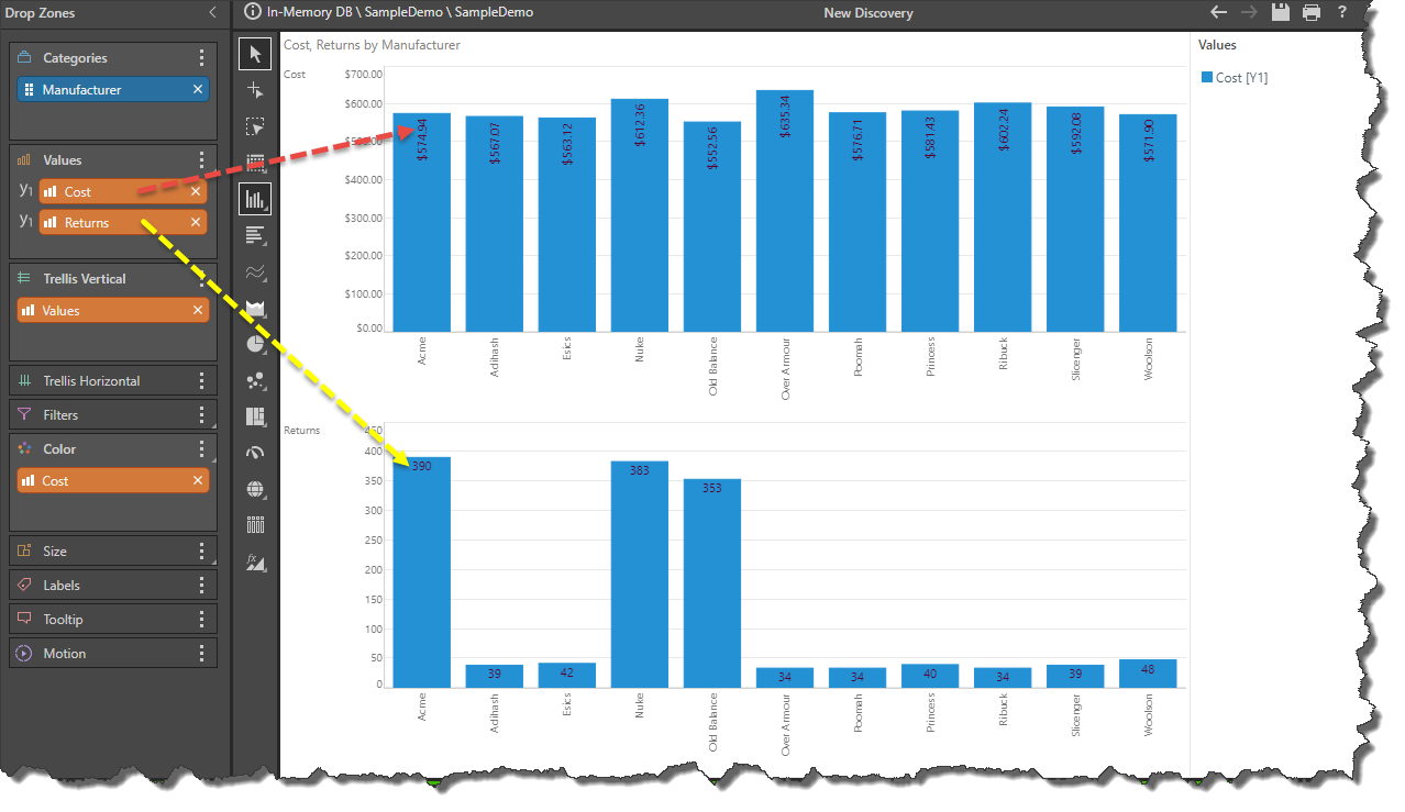 Add the measure that should be used to label the chart to the Labels zone. In this example, the chart displays Sales by Manufacturer, but the columns are labeled by Net Margin.