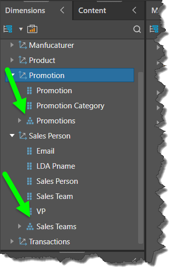 Parent-child hierarchies in MS OLAP and SAP BW hierarchies are reflected in the hierarchy tree in Pyramid. They are designated by a pyramid icon, as opposed to the flat 6-pack icon.