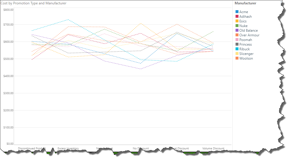 In the image below, the default solid line style is applied to all series members except 2; a dashed line was applied to the Poomah series (pink arrow) and a dotted line to the Acme series (blue arrow).