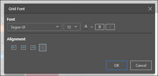 From the Grid Font dialog, users can make changes to the data cells in the grid. Users may change the font type, size, color, emphasis and alignment. Changes made here will be applied to all data cells in the grid.