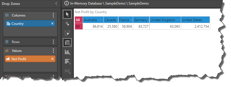 The trigger element is Cells, so the captions for the selected data point will be injected. In this example, a single country caption will be injected.