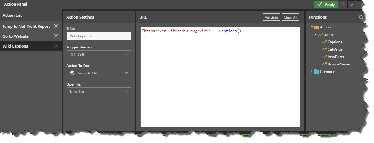 You can build actions by writing a PQL expression made up of a specified URL and PQL function(s) (either Jump functions or Common functions). When the action is selected the dynamic expression is used to load the URL. Depending in the way you've configured the action, the URL will be opened in a new tab, in a pop up, or in the current tab.