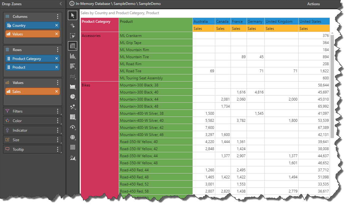 The elements were added to the query, in the green column labeled Product. Because the selection type was "Create Selection" if the query already contained a list of elements derived from the members search, from the same hierarchy (in this case, from the Product hierarchy), the previous elements selection will be replaced by the new one.