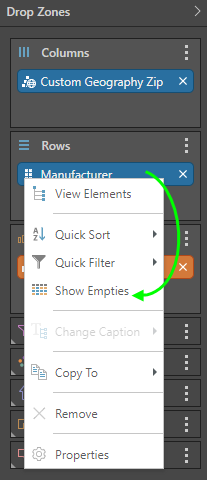Empties can also be shown by right clicking on an OLAP hierarchy chip in the drop zone to show / hide its empties.