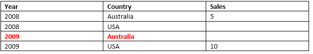 Notice that the OLAP / MDX result manufactures 2009-Australia, while the SQL / PQL result does not.