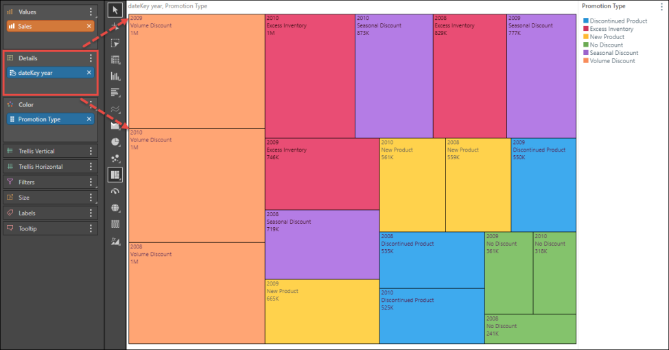 Using the Sample Demo model, add the Promotion Type hierarchy to the Color drop zone;