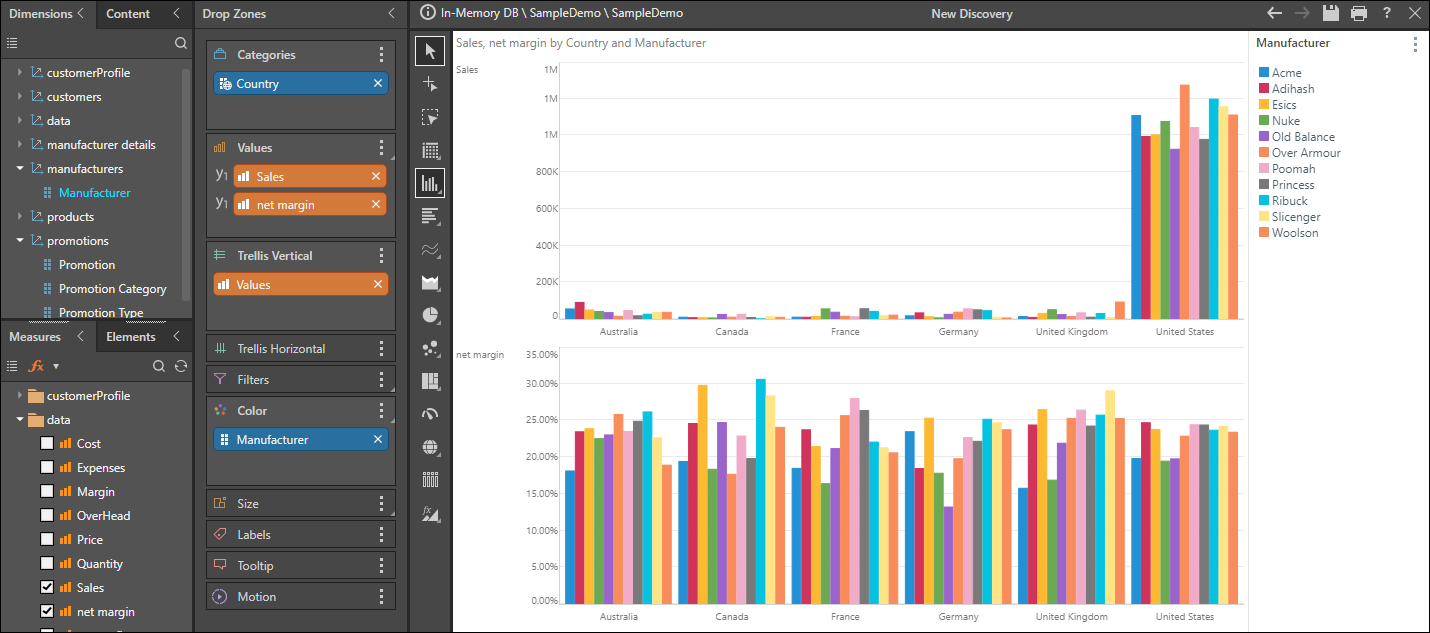 For example, in the chart below we see sales across three countries, and six promotion types. The color of each segment denotes the promotion type, while the size of the segment indicates the percentage of sales. So according to the chart, Volume Discount accounted for over 40% of sales in the United Kingdom.