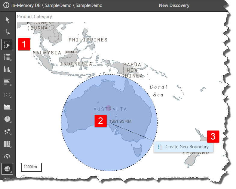 A geo-boundary is a type of context calculation that is used to create a custom column which divides the map into 2 members: "in" (the geo-locations within the radius of the geo-boundary), and "out" (the geo-locations outside the geo-boundary). This provides the option of splitting the map into different 'sections,' which can then be used to drive which part of the map is displayed.