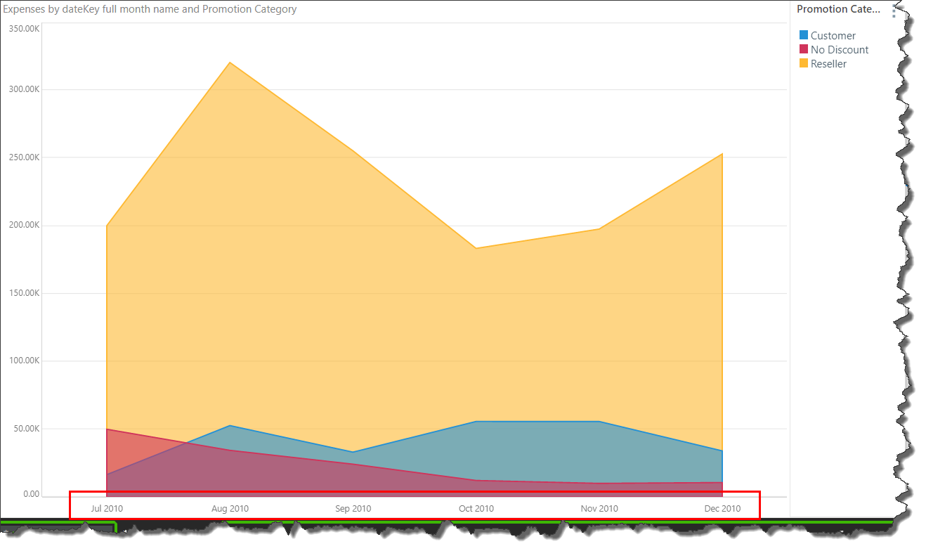 You can add a date-time calculation as a hierarchy selection, or as a filter selection. The former option allows you to add the date-time calculation to the visualization as any other hierarchy. This is useful if, for instance, you want your visual to display a trend over time. For example, the visual below displays expenses for promotions; adding the full month calculation as a hierarchy added the months to the y-axis, so the visual displays a monthly trend: