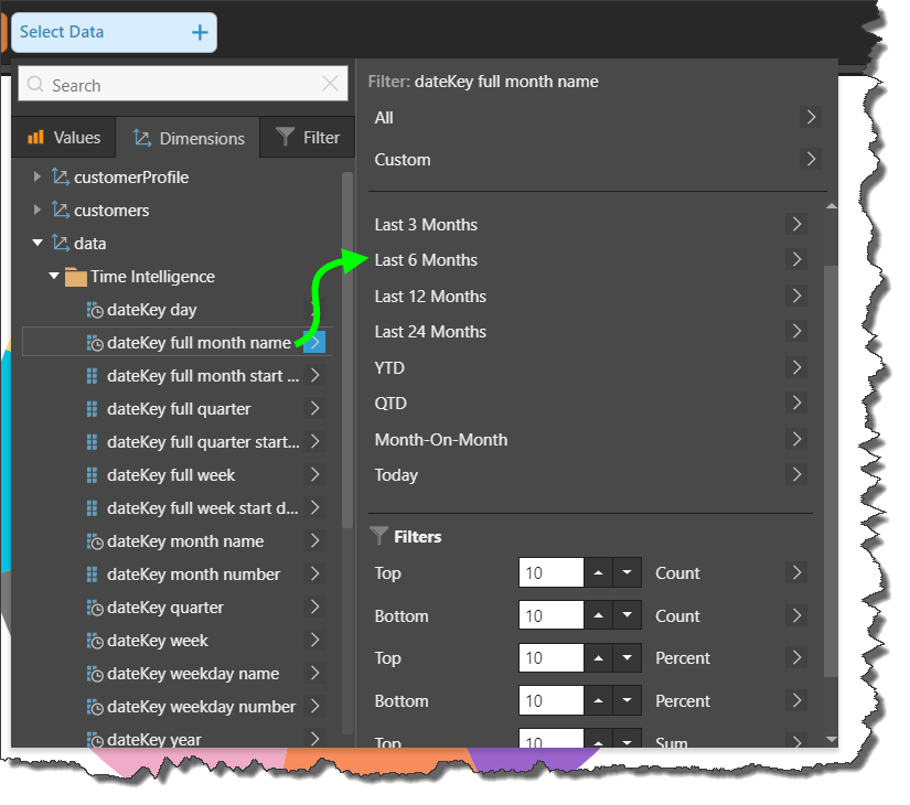 Now the Last 6 Months calculation was selected from the 'full month name' hierarchy from the Time Intelligence folder: