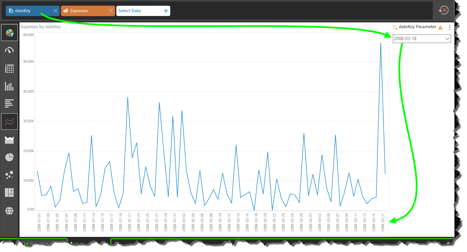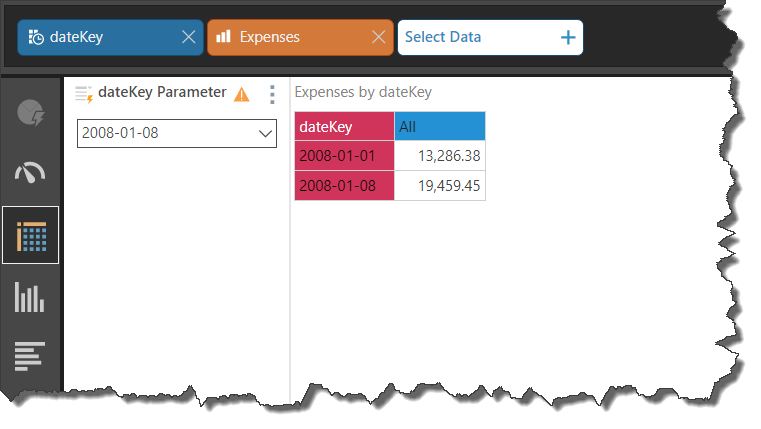 When selected, a parameter slicer is added to the canvas; this slicer lists all the dates in the dateKey hierarchy. When a date is selected from the slicer, the chosen date and the date 1 week prior to it are added to the visual. Here, the date selected was 8 Jan, 2008; the dates added to the visual were 8 Jan and 1 Jan 2008: