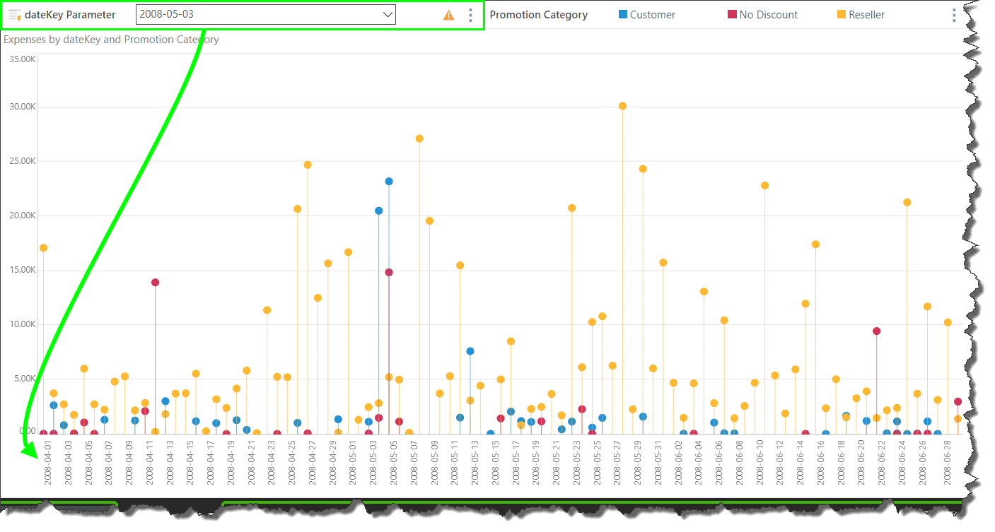 When the next slicer is opened, it displays all dates in Q2, 2008, in accordance with the date selected from the parameter slicer. A date must then be selected from this second date slicer in order to filter the visual: