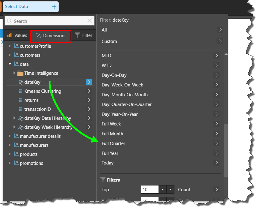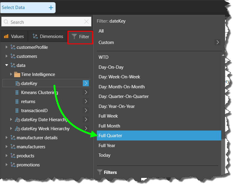 Current DateKey Quarter: shows the current quarter; available for the Year hierarchy.