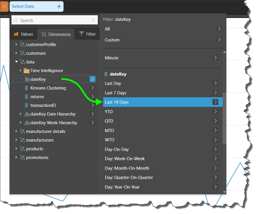 When querying an SQL datasource, you will also see a number of Date Part calculations exposed from the dateKey hierarchy. The date part functions extract classic date/ time groupings (like months, weeks, and years) from the dateKey hierarchy can add them to the visual. Like date/ time calculations, date parts can be