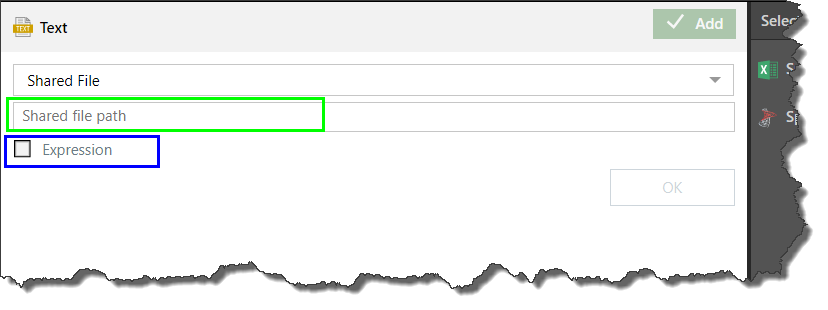 To connect to a shared file, enter the shared file path the in the appropriate field (green highlight below). The shared file must use a UNC file path format to the shared directory and file on the network. The machine hosting Pyramid must have access to the shared file location. If the Pyramid services are running on different machines, the Runtime and Task Servers must be given access to the shared file location.