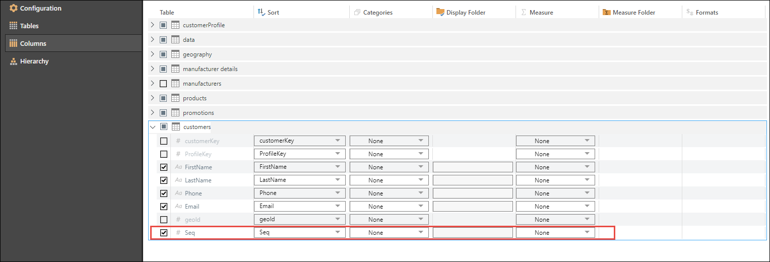 By default, Sequence columns are hidden and do not appear in the data model in Discover unless unhidden from Data Modeling.