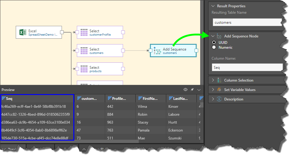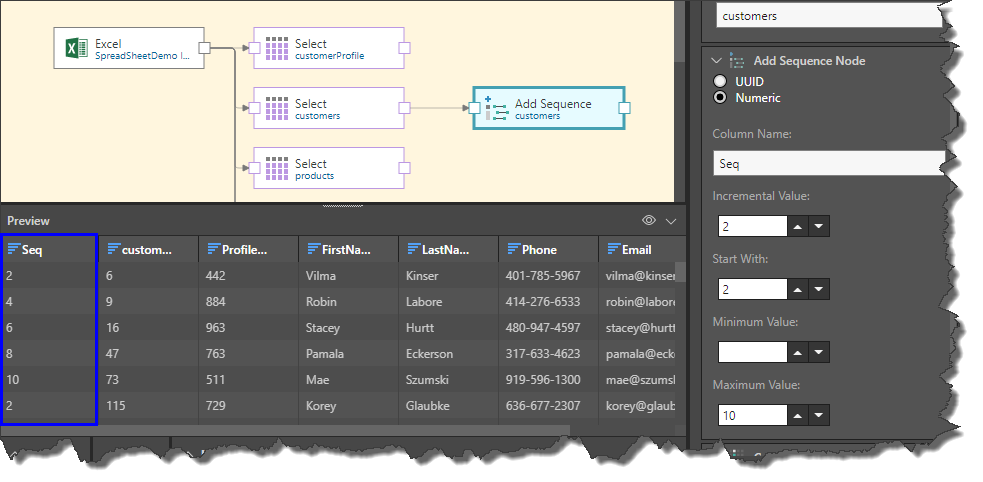 Connect the Sequence node to the Select node representing the relevant table. Go to the Properties panel to configure the node: