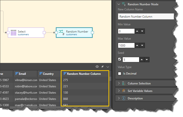 Here the Random Number column was assigned a max value or 1000 and a seed value of 5: