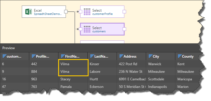 In this example, we have three duplicates in the FirstName column (orange highlight below). However, as we see in the customerKey column (green highlight), these rows are not consecutive: