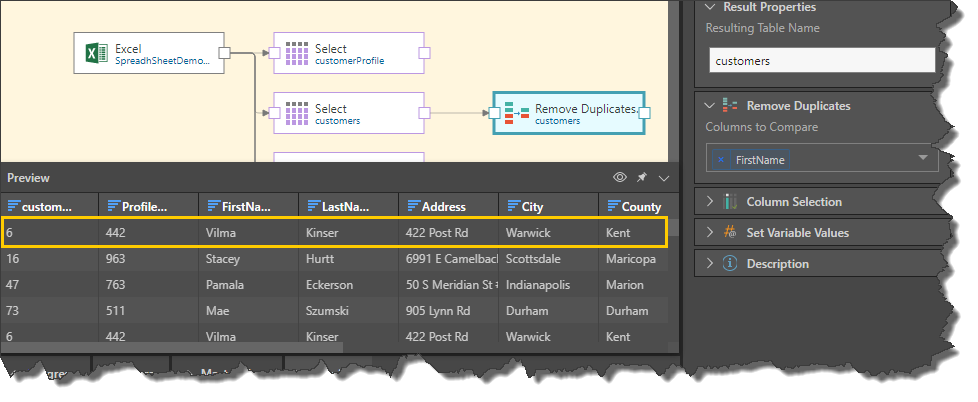 The Remove Duplicates node will retain the first duplicate row and remove the remaining duplicate rows. For example, say the First Name column is selected as a column to compare, and the column contains three customers with the first name 'Fred'. The last name of each of these 'Fred's is Johnson, Jackson, and Jason. The first row containing 'Fred' will be retained in the First Name column, and the other two will be removed.